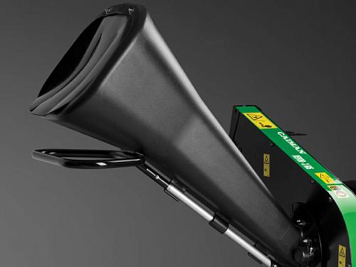 Широкий загрузочный бункер. На измельчителе установлен широкий загрузочный бункер, облегчающий подачу ветвей для измельчения. Наличие удобной транспортировочной рукоятки позволяет легко перемещать агрегат по территории. Для компактного хранения бункер быстро демонтируется, благодаря быстросъемным креплениям.